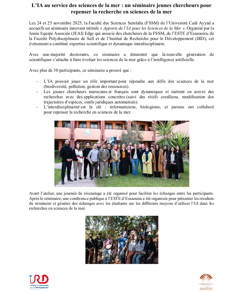 Ce séminaire s’inscrit dans le cadre du Projet Nawras qui vise à évaluer la protection juridique de l’environnement marin grâce à l’Intelligence Artificielle. Co-organisé par l’Université Cadi Ayyad et l’Institut de Recherche pour le Développement, il a rassemblé des chercheur\(\cdot\)euses en sciences de la mer, en droit et en intelligence artificielle travaillant sur des sujets transverses.